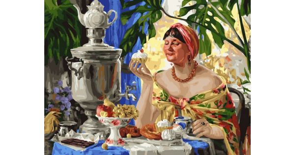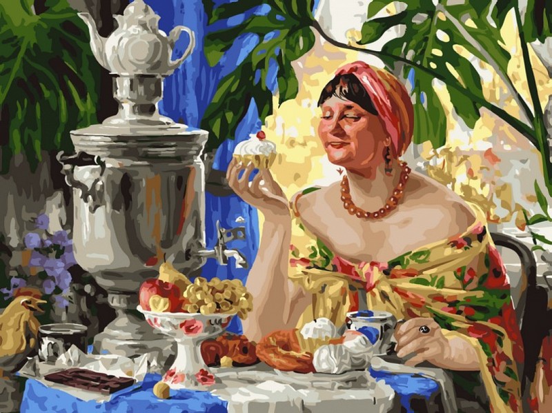 Живопись по номерам По мотивам Б.Кустодиева. Чаепитие у самовара., 30x40, Белоснежка